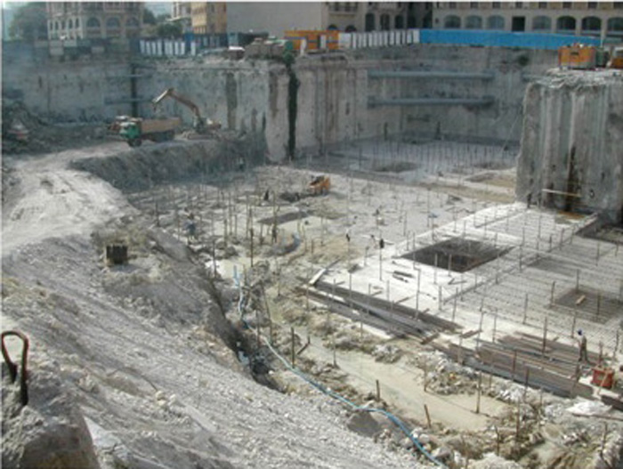 Paroi moulée, tirants précontraints, radier injecté, puits de pompage, radier en béton armé associé à des micro-pieux..